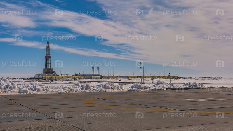 Инфраструктура буровой установки на арктическом нефтегазовом месторождении. На переднем плане вертолетная площадка. Полярный день. Облачное небо