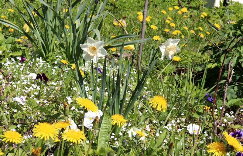 Белые садовые нарциссы среди одуванчиков на клумбе в саду