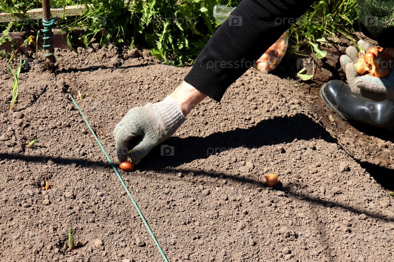 Мужчина сажает второй ряд луковиц, руки в перчатках, крупный план