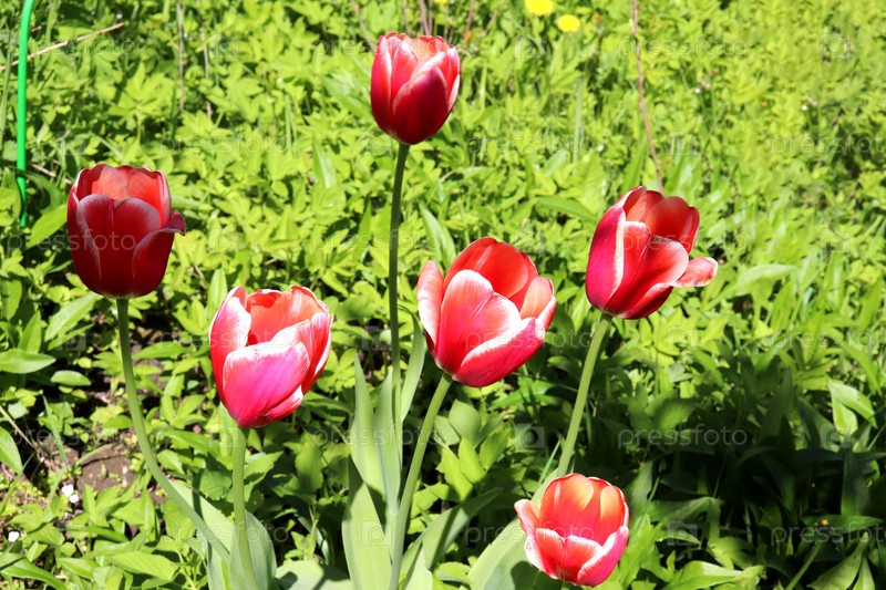 Красно-розовые тюльпаны на клумбе в солнечный день