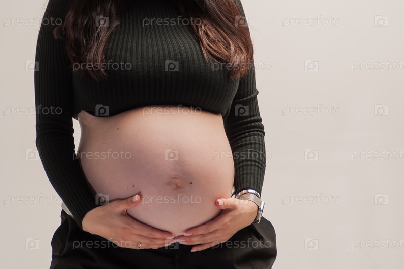 Беременная женщина с большим животом позирует в фотостудии