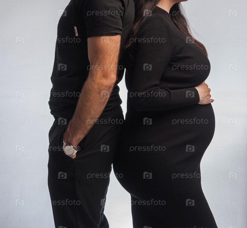 Супруги, мужчина и его беременная жена позируют в фотостудии