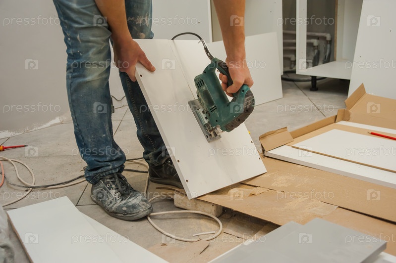Процесс распиловки плит ДСП лобзиком при сборке мебели