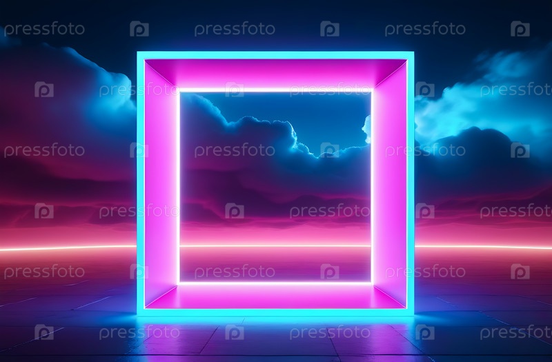 3D-рендеринг, абстрактный минимальный фон с розово-синим-желтым неоновым светом квадратная рама со пространством для копирования, освещенные грозовые облака, сияющие геометрические