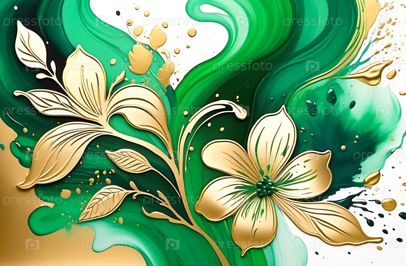 Акварельно-акриловый цветочный фон с переливами золотого и изумрудно-зеленого цветов