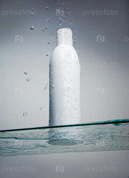 Шампунь на белом фоне с каплями воды