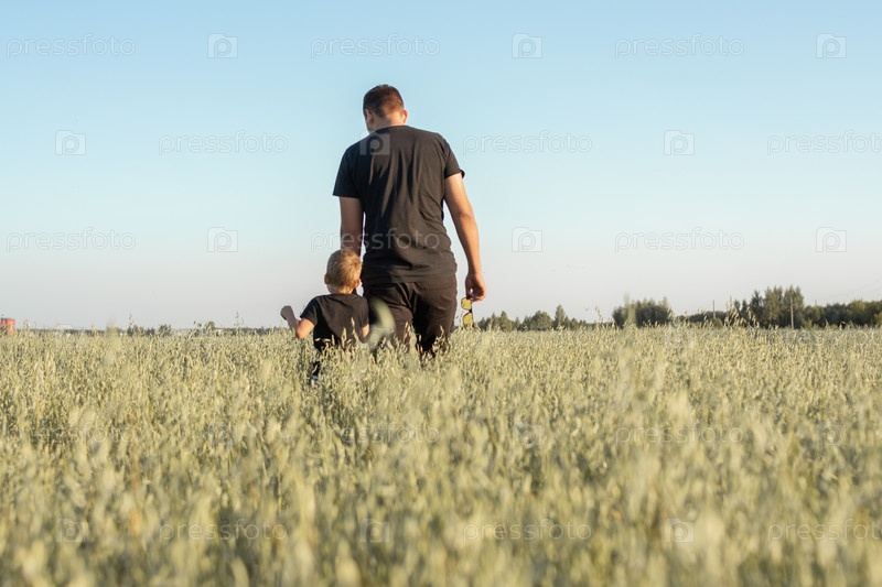 Папа с сыном идут за руку по полю