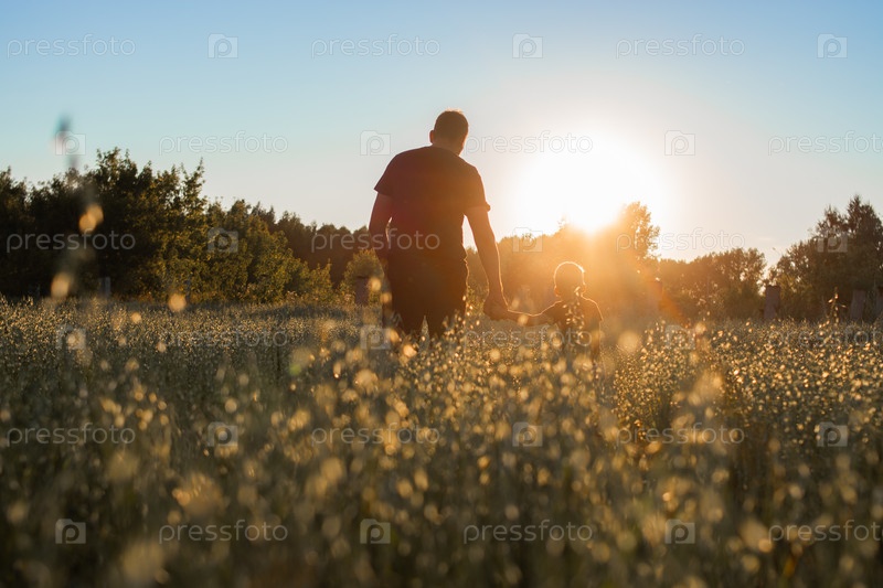 Папа с сыном идут за руку по полю