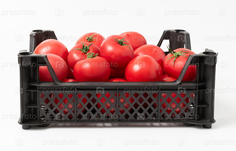 Спелые помидоры в черной пластиковой коробке