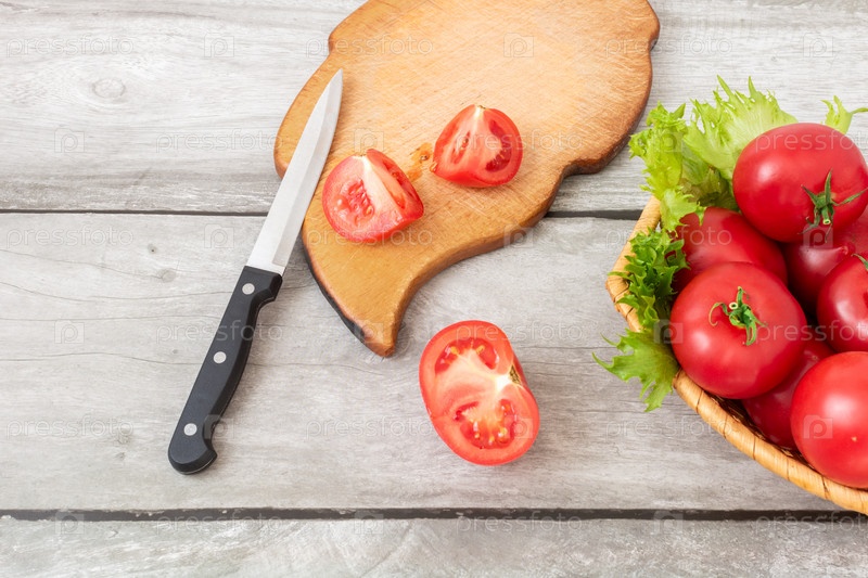 Нарезанный помидор на доске, нож и помидоры в корзине с листьями салата на светлом деревянном фоне