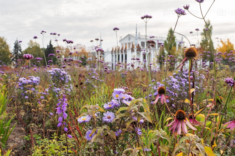 Москва, Россия - 08 ОКТЯБРЯ 2020 г.: Осенний вид на павильон нефтяной промышленности на ВДНХ через Мичуринские сады