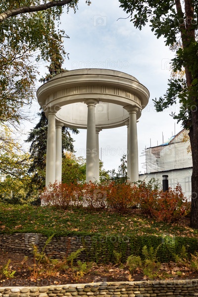 Москва, Россия - 08 ОКТЯБРЯ 2020 г.: Каменная ротонда пейзажной горки на осеннем ВДНХ, Сочинская горка