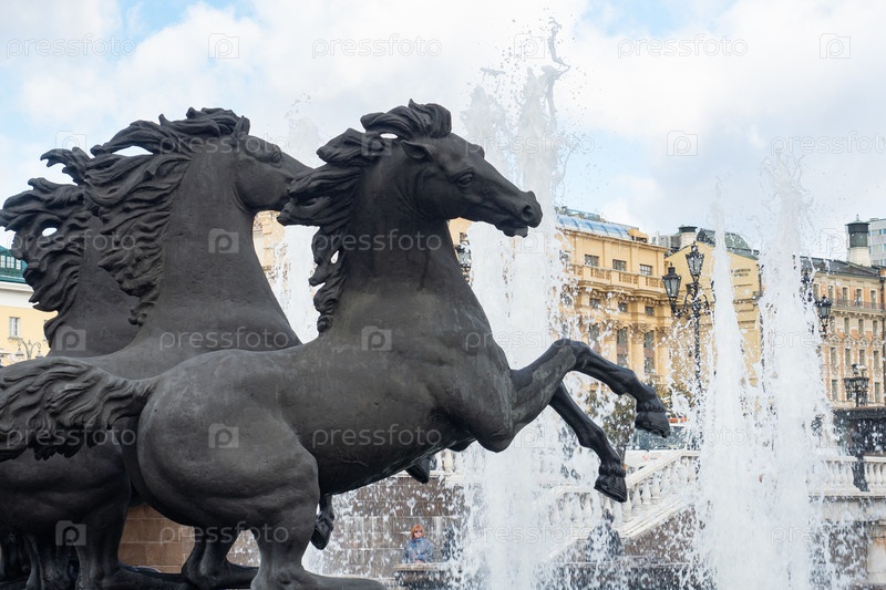Москва, Россия - 01 ОКТЯБРЯ 2020 ГОДА: Скульптура четырех бронзовых лошадей называется "Четыре сезона года"