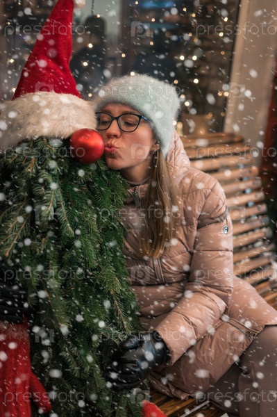 Красивая женщина с манекеном, украшенным елкой. Рождественские праздники, Новый год или Рождество