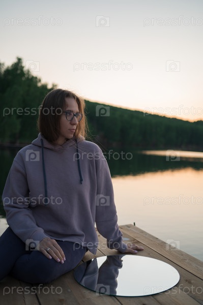 Женщина, сидящая на пирсе у озера с круглым зеркалом, летний закат