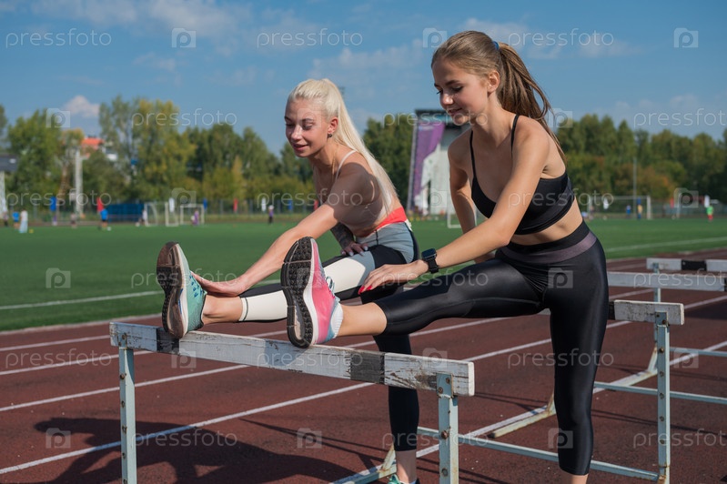 Две спортсменки, молодые бегуны на стадионе на открытом воздухе