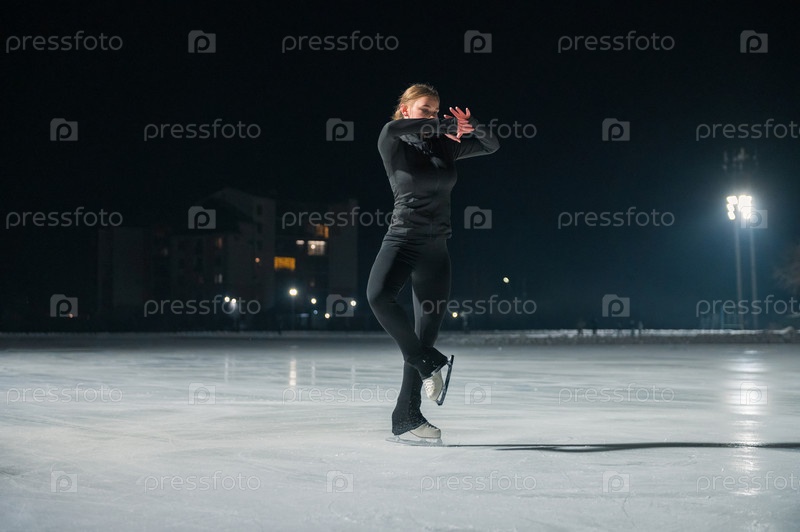 Красивая молодая женщина катается на коньках и выполняет короткую программу