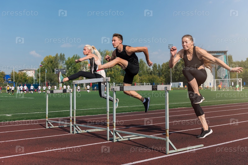 Две спортсменки, женщина и мужчина, бегут с препятствиями на стадионе на открытом воздухе