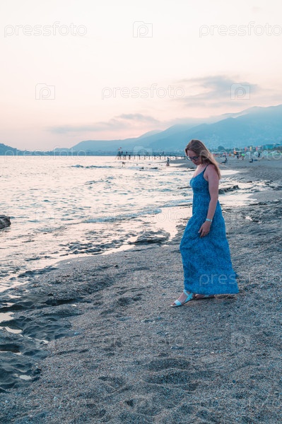 Женщина сидит на пляже и смотрит на море в городе Алания, Турция. Концепция путешествия или отпуска