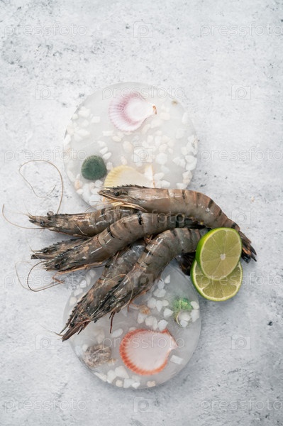 Сырые креветки на украшенном льду