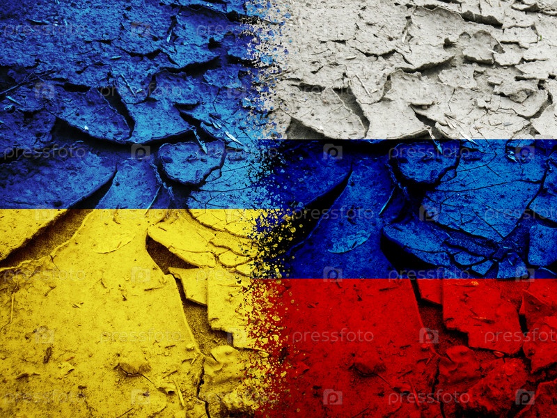 Образец национальных флагов России и Украины на шероховатой сухой растрескивающейся земле