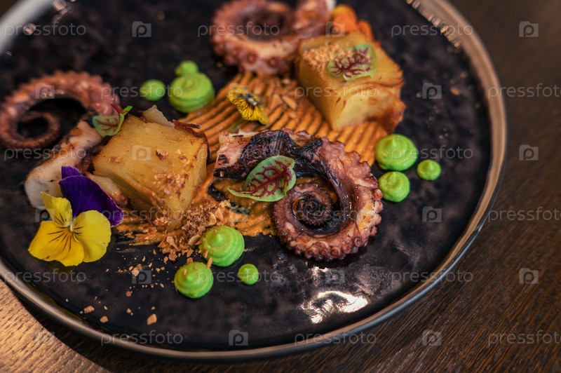 Осьминог с картофелем на гороховом пюре