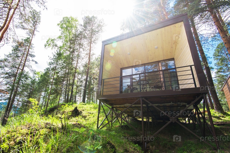 Дом или гостиница с панорамными окнами в сосновом лесу
