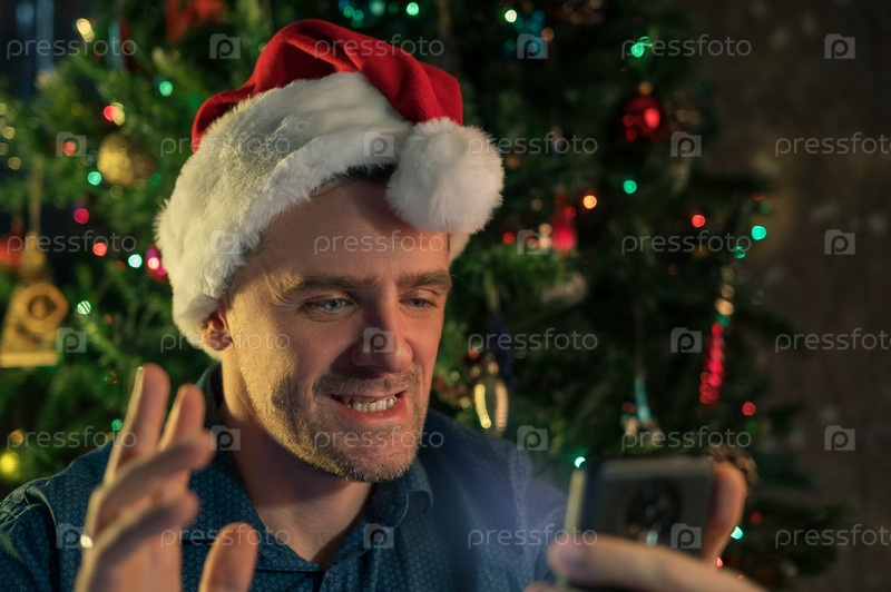 Счастливый человек звонит друзьям на Рождество с помощью смартфона