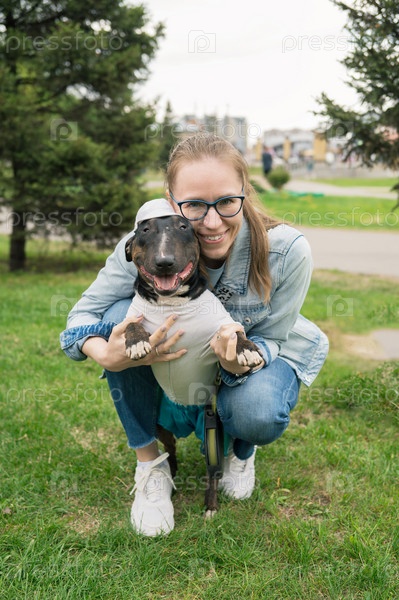 Женщина гуляет с бультерьером на улице