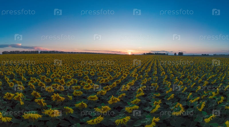 Вид с дрона на поле подсолнечника на красивом вечернем закате. Вид с воздуха на сельское хозяйство спелых подсолнухов