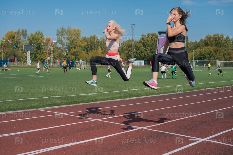 Две спортсменки-бегунки тренируются на стадионе на открытом воздухе