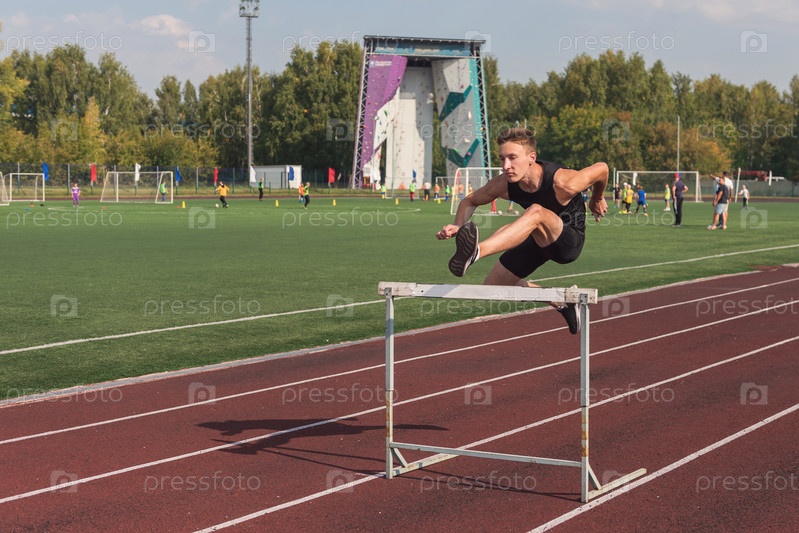 Молодой человек спортсмен бегун бегает с препятствиями