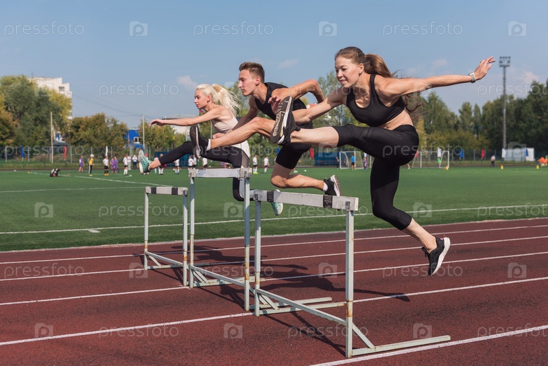Две спортсменки, женщина и мужчина, бегут с препятствиями на стадионе на открытом воздухе