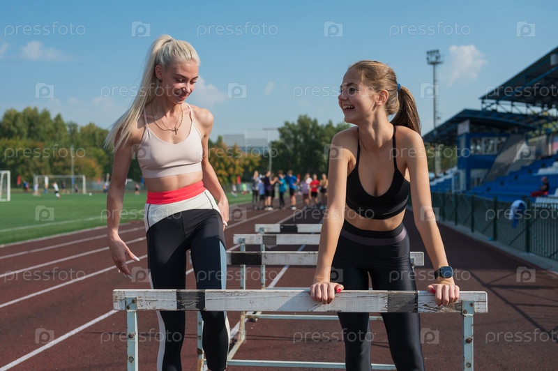 Две спортсменки-бегуны на стадионе на открытом воздухе