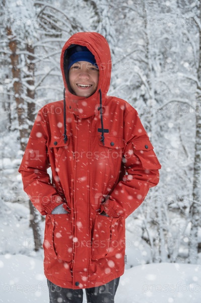 Мальчик гуляет по заснеженному зимнему лесу