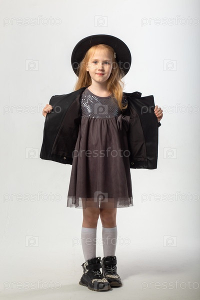 Маленькая блондинка в кожаной куртке и черной шляпе позирует в студии на белом фоне