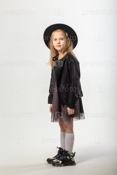 Маленькая блондинка в кожаной куртке и черной шляпе позирует в студии на белом фоне
