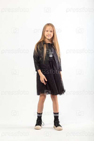 Полнометражный портрет молодой девушки с длинными каштановыми волосами, одетой в хулиганском стиле на белом фоне в студии