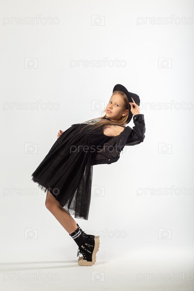 Полнометражный портрет молодой девушки с длинными каштановыми волосами, одетой в хулиганском стиле на белом фоне в студии