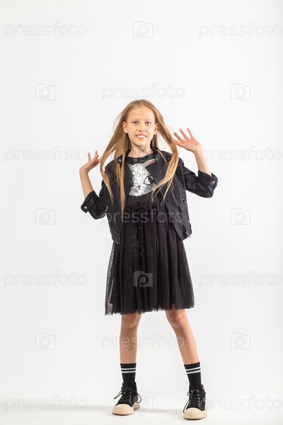 Портрет молодой девушки в полный рост с длинными каштановыми волосами, одетой в хулиганском стиле