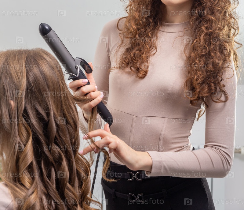 Стилист-парикмахер готовит женщину, делает прическу для завитков с помощью щипцов для завивки. Длинные темно-русые натуральные волосы