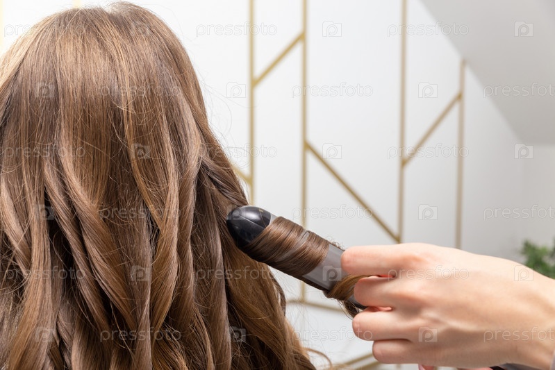 Стилист-парикмахер готовит женщину, делает прическу для завитков с помощью щипцов для завивки