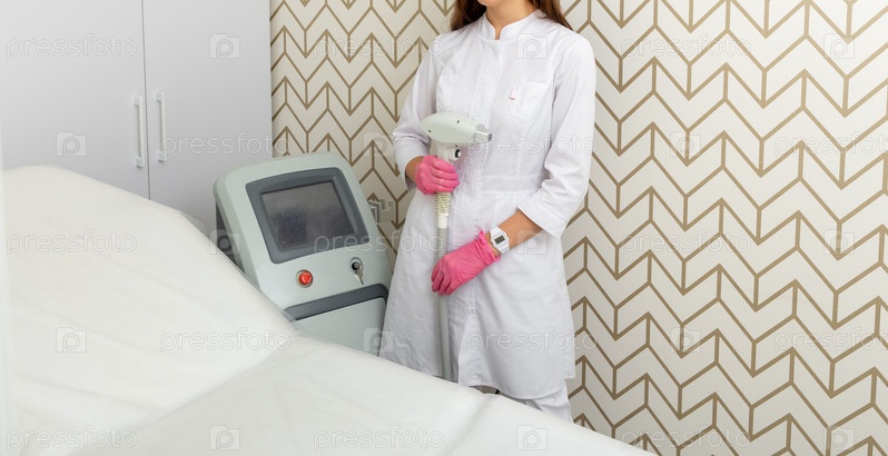 Женщина-дерматолог позирует с инструментом для удаления волос диодным лазером