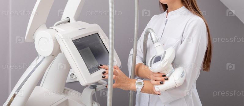 Женщина-врач позирует с машиной для сжиженного нефтяного газа