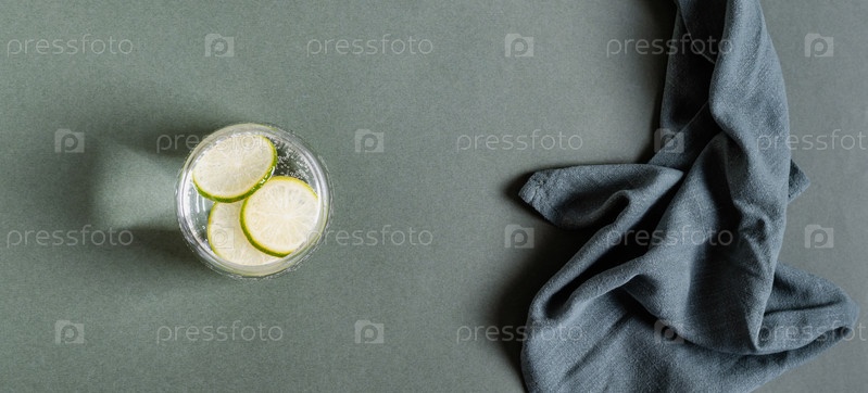 Освежающая вода с ломтиками лайма в стакане и ткань на зеленом фоне, вид сверху веб-баннер