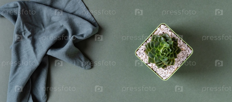 Сочные в декоративном горшке и ткани на зеленом фоне, вид сверху веб-баннера