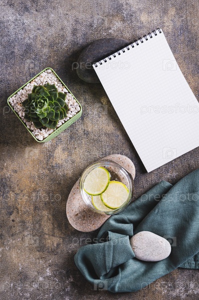 Чистая вода с ломтиками лайма в стакане на камне, блокноте и сочном верху и вертикальном виде
