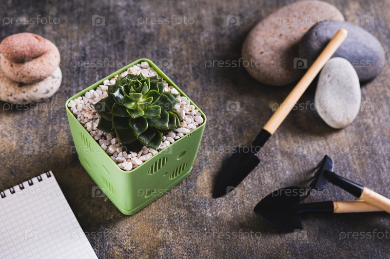 Суккулентное растение, инструменты для домашнего сада, блокнот и камни на столе