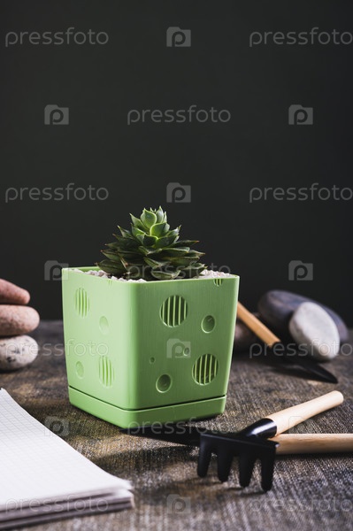 Сочные в горшке и инструменты для домашнего садоводства на столе, вертикальный вид