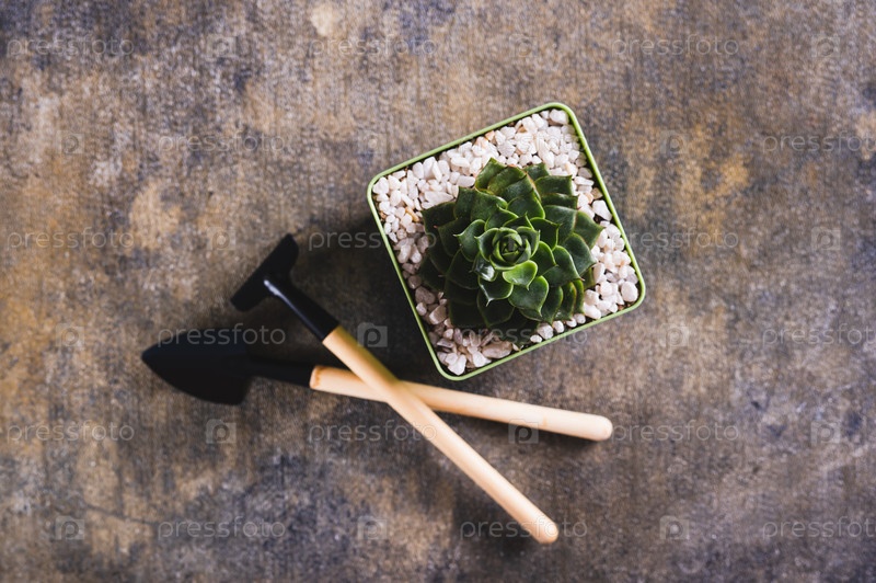 Крупный план суккулентов в горшке и инструментов для домашнего садоводства на столе